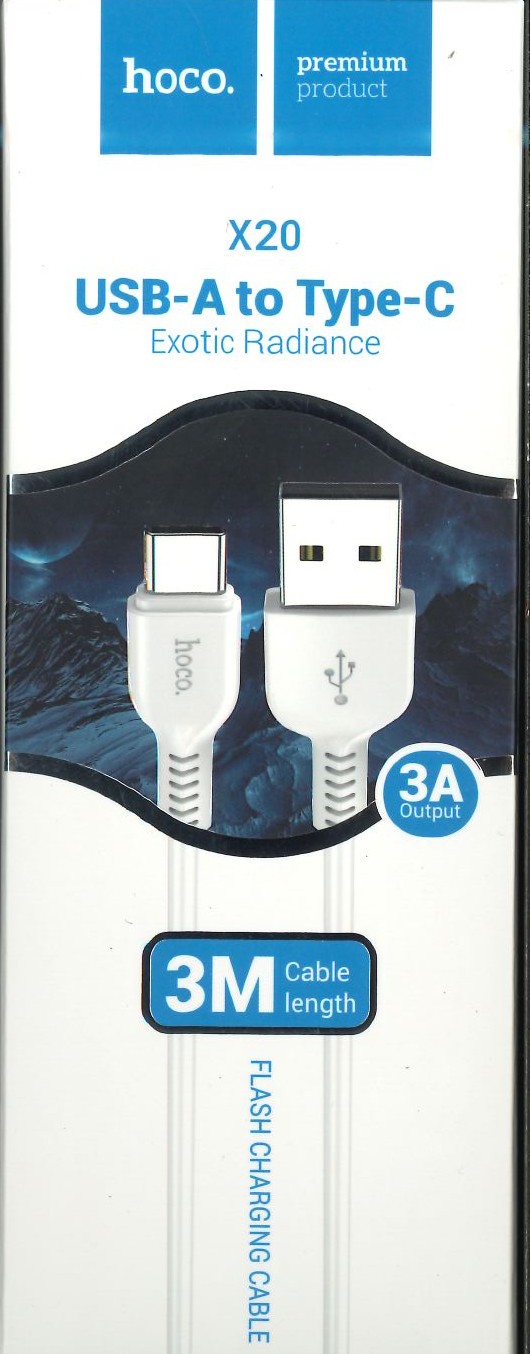 X20 Flash charging data cable 2.0A for Type-C phone wire charger TPE connector 1m 2m 3m smartphone charge cord - Length/weight: 1m / 24g, 2m / 40g, 3m / 56g. - Outer coating: PVC. - Connector: TPE. - Core wire: 102pcs copper wires. - Support charging and data transmission, rated current: 2.0A.